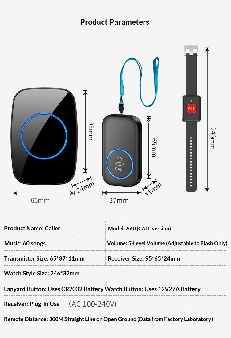 Specifications: Watch button + lanyard button + receiver (black), watch button + lanyard button + receiver (white)